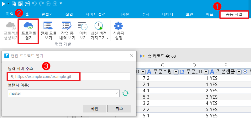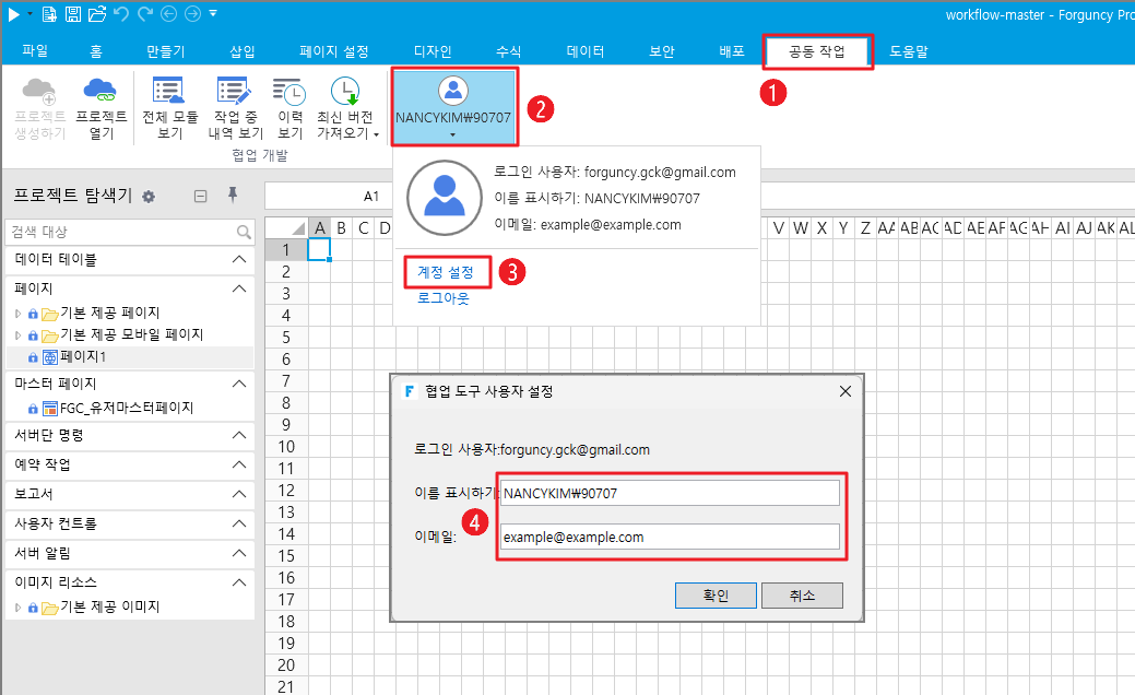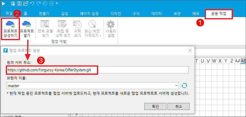 ![](https://help.grapecity.com.cn/download/thumbnails/72363999/%E6%AD%A5%E9%AA%A44.png?version=1\&modificationDate=1648092709000\&api=v2) 협업개발을 위한 포건시 파일 또는 빈 프로젝트를 열고 리본 메뉴 모음에서 \[공동작업-> 프로젝트 생성하기]를 선택하여 공동 작업 프로젝트 작성 대화 상자를 팝업합니다.