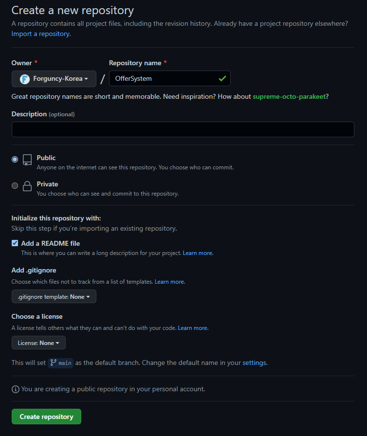 아래    Create a new repository 버튼을 클릭합니다.&#x20;