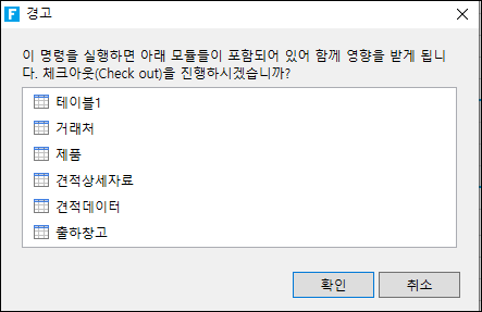 이렇게 하면 모든 내장 테이블을 체크 아웃하고 확인을 클릭하여 계속하라는 메시지가 표시됩니다.