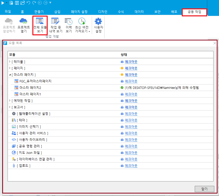 모듈 대화 상자에는 문서의 모든 모듈과 모듈의 상태가 나열되어 있으며 수정된 모듈을 체크 아웃한 사용자를 확인할 수 있습니다.