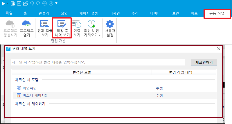 리본 메뉴 모음에서 \[공동작업-> 작업 중 내역보기]를 선택하여 변경 대화 상자를 표시합니다.