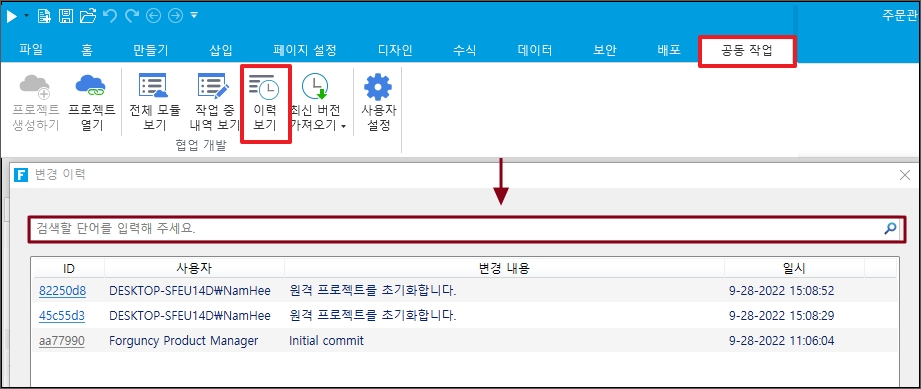 리본 메뉴 모음에서 [공동작업-> 이력보기]을 선택하고 모든 작업 레코드가 나열된 기록 대화 상자를 표시합니다.