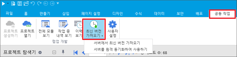 리본 메뉴 모음에서 \[공동작업-> 최신 버전 가져오기]를 선택하고 드롭다운 버튼을 클릭하여 최신 버전을 가져오거나 최신 버전으로 강제 동기화하도록 선택합니다.