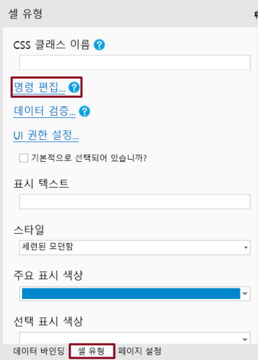 이미지 업로드, 첨부 파일, 데이터 탐색 버튼, 페이지 매김 탐색 버튼, 프로세스 막대, 로그인 사용자 및 바코드 셀 유형을 제외한 모든 셀 유형은 편집 명령을 지원합니다. 페이지가 로드될 때 명령을 설정할 수도 있습니다.