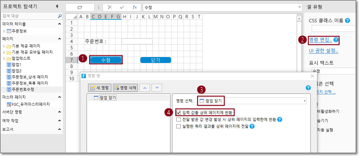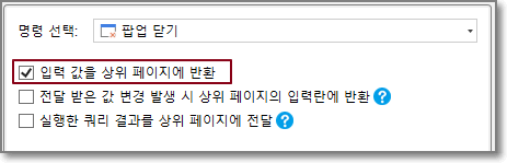 팝업 페이지를 엽니다. 페이지에서 [수정] 버튼의 명령을 편집하고[팝업 닫기] 명령으로 명령을 선택하고 [입력 값을 상위 페이지에 반환]을 선택합니다.