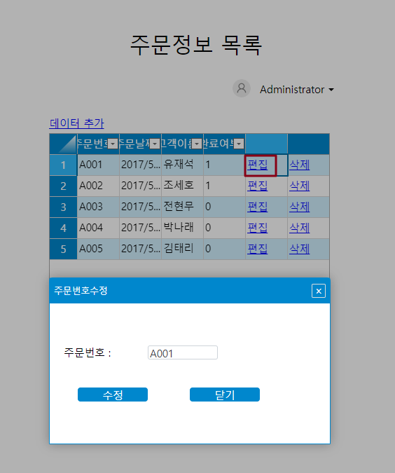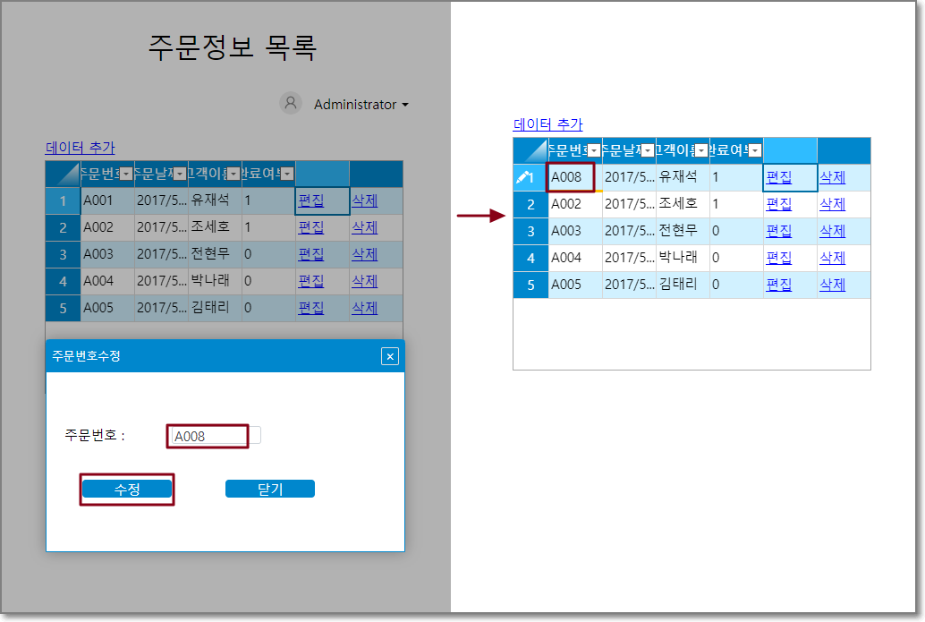 팝업 페이지의 텍스트 상자에서 주문 번호를 수정한 후 수정 버튼을 클릭합니다. 주문 목록 테이블의 첫 번째 주문 라인에 대한 주문 번호가 A008로 업데이트되었음을 확인할 수 있습니다.