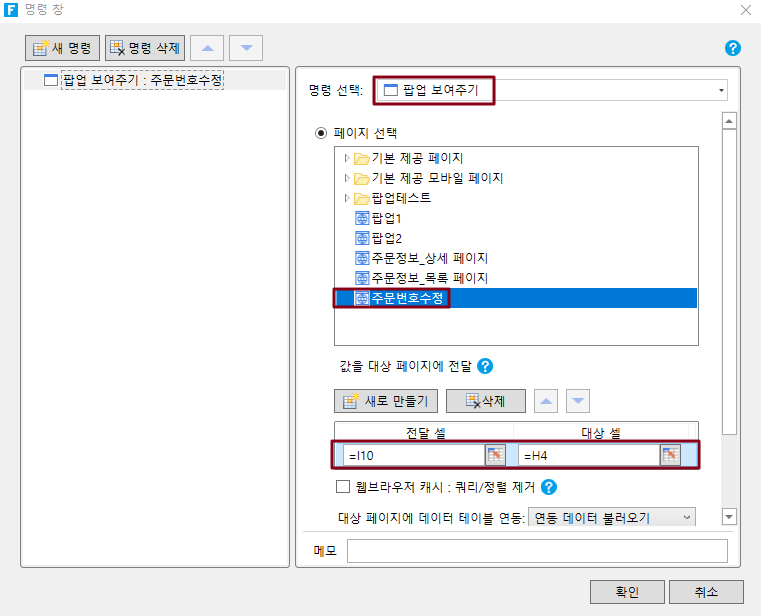 설정 명령은 팝업 페이지이며, 페이지는 팝업 페이지를 선택하고 테이블의 주문 번호가 있는 셀 I10의 값을 팝업 페이지의 대상 셀 H4로 전달합니다.