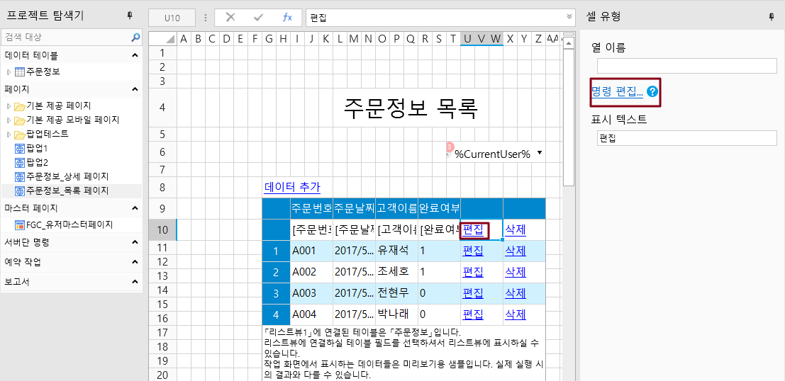 다음은 주문 목록의 데이터를 수정하여 값을 테이블로 다시 전달하는 방법을 보여 줍니다.