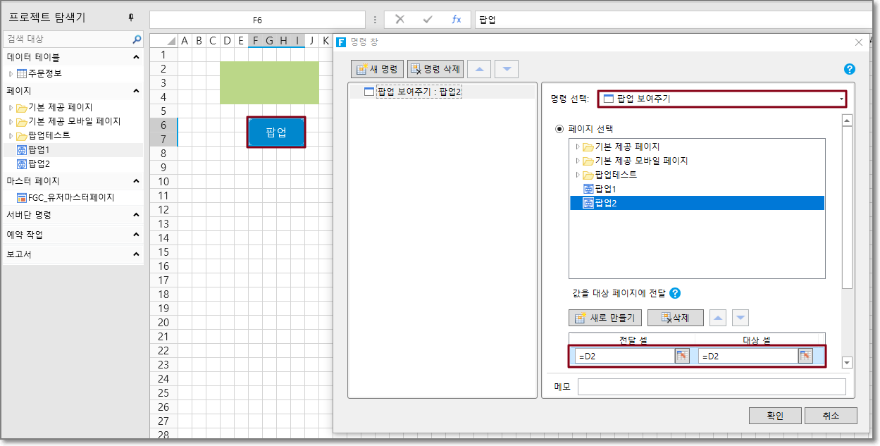 예를 들어 팝업페이지 1에서 팝업 버튼의 명령은 "팝업 페이지"이며 버튼을 클릭하면 팝업페이지 2가 팝업되고 팝업페이지 1의 D2 값이 팝업페이지 2의 D2로 전달됩니다.