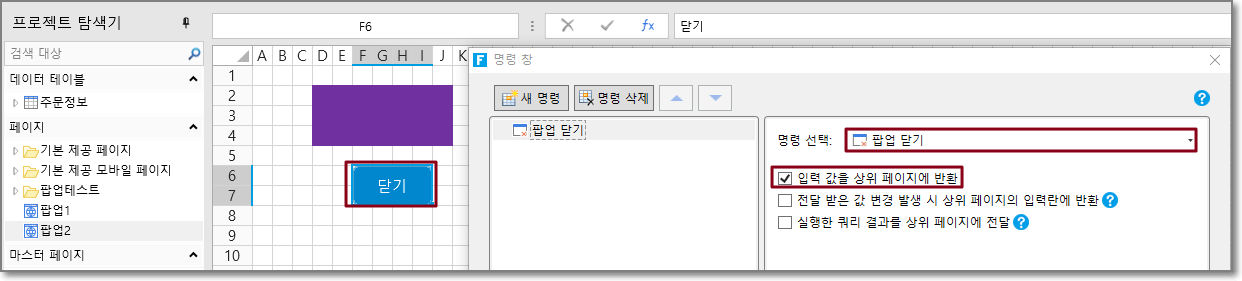팝업 페이지 2에서 닫기 버튼 명령은 팝업 닫기이며 입력 값을 상위 페이지에 반을 선택합니다.
