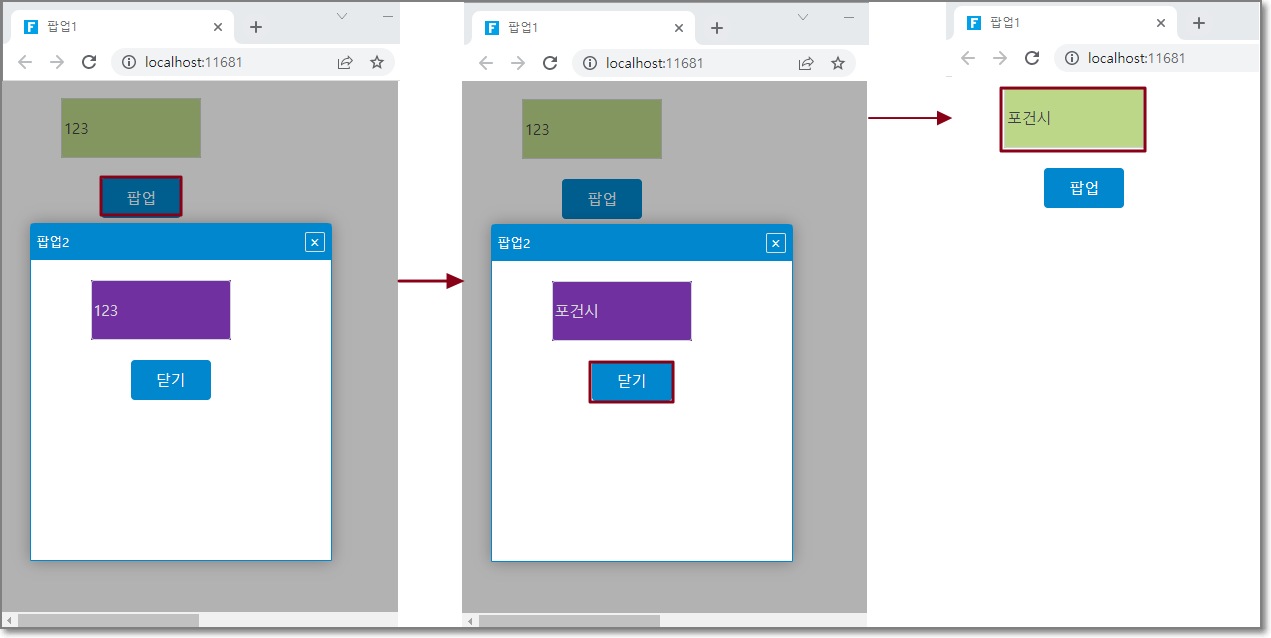 값 "123"을 "포건시"로 수정한 후 "닫기" 버튼을 클릭하여 팝업페이지 2를 닫으면 팝업페이지 1의 값이 팝업페이지 2에서 수정된 값이 됩니다. 즉, 팝업 페이지의 값이 원본 페이지로 다시 전달됩니다.