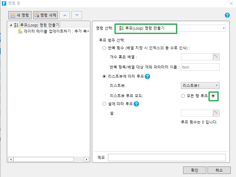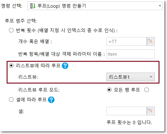 루프 명령의 리스트뷰별 루프를 사용하면 리스트뷰의 여러 데이터 열을 다른 리스트뷰에 복사할 수 있습니다.