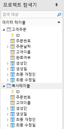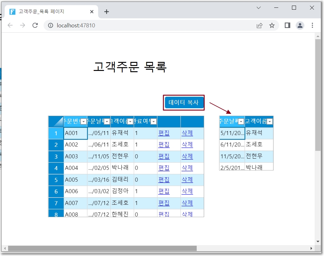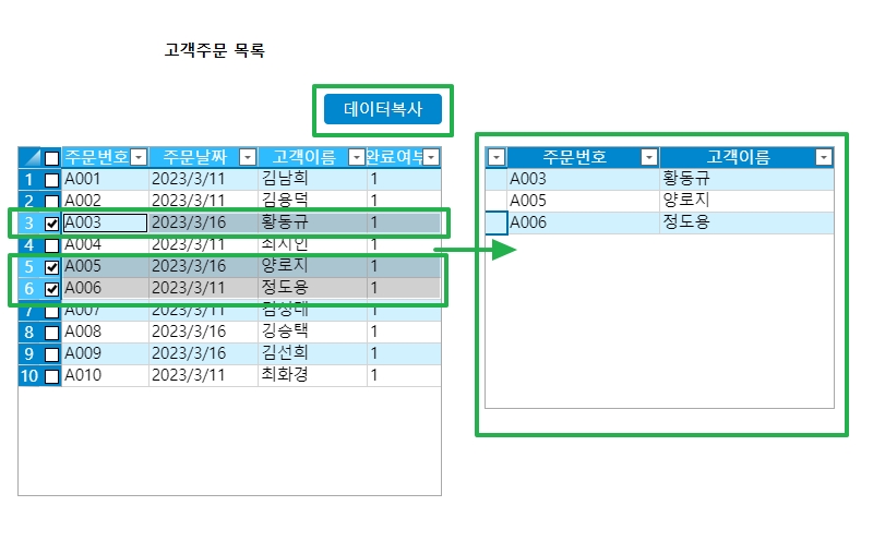 고객주문 테이블과 선택한 행을 추가할 테이블을 만듭니다.