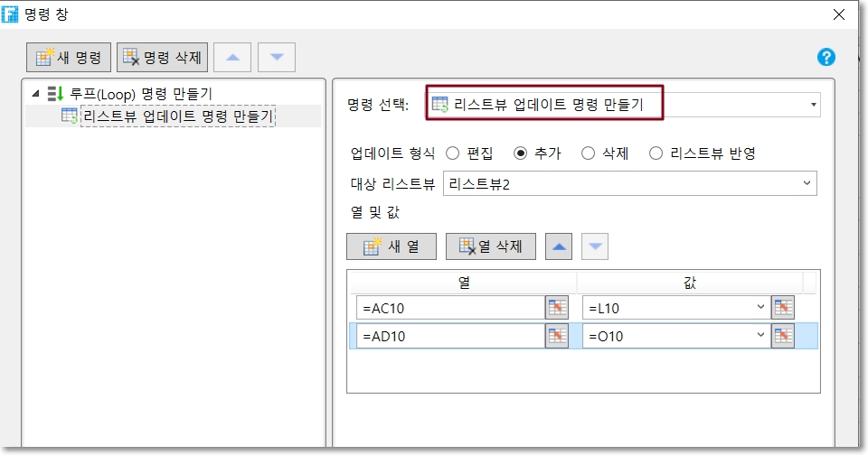 다음 그림과 같이 루프의 하위 명령을 리스트뷰 업데이트 명령만들기로 설정하고 다음 그림과 같이 추가 유형을 설정하려면 [빈 명령]을 클릭합니다.