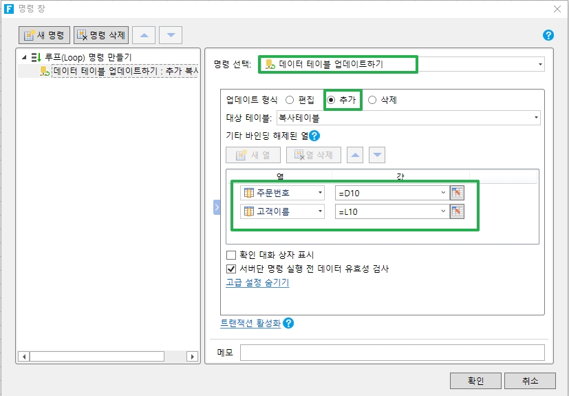[데이터복사] 버튼을 생성한 후, 명령 편집을 아래와 같이 설정합니다.