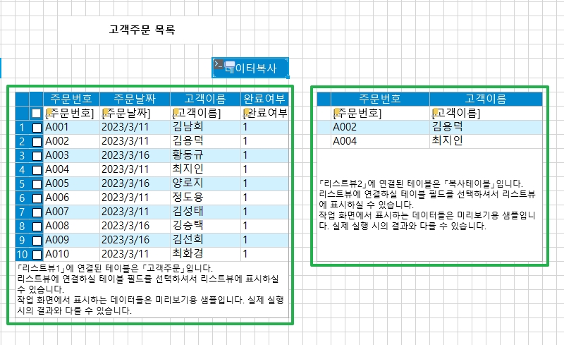 고객주문 테이블과 연결된 리스트뷰와 복사테이블과 연결된 리스트뷰를 생성합니다.