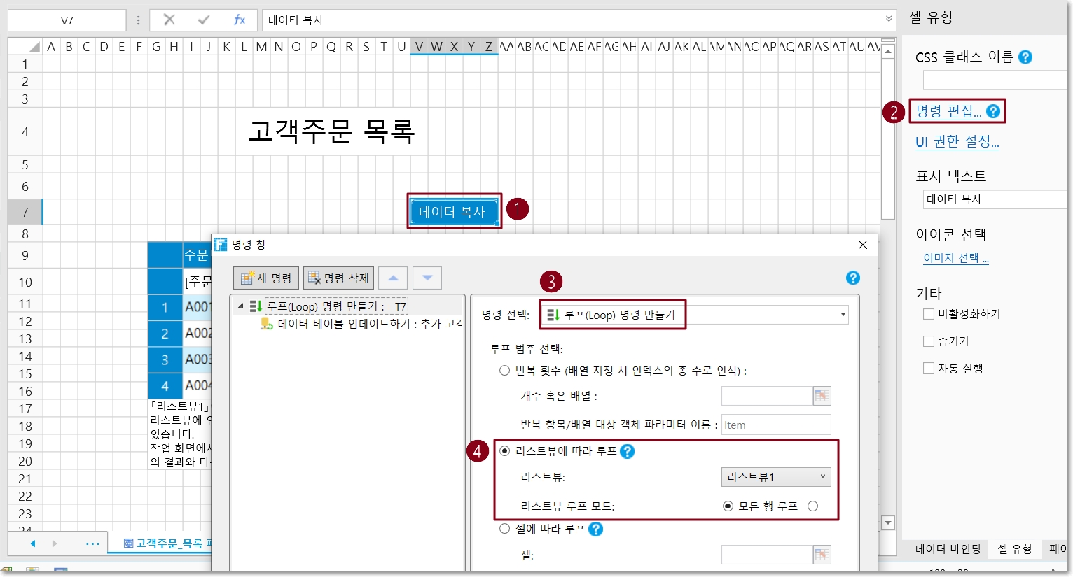 목록 페이지의 데이터 복사 버튼에서 명령을 반복 명령으로 설정하고, 리스트별 루프로 루프를 선택하고, 리스트뷰를 리스트 1로 선택하고, 리스트뷰 루프 모드를 다음 그림과 같이 모든 행을 반복합니다.