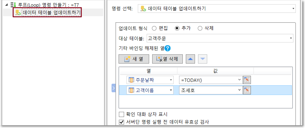 다음 그림과 같이 루프의 하위 명령을 데이터 테이블 작업으로 설정하고 다음 그림과 같이 데이터 테이블 작업을 추가합니다.