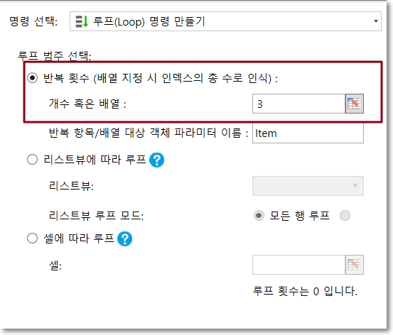 지정된 횟수만큼 반복하도록 선택한 후 고정 값, 수식을 입력하거나 셀을 선택할 수 있는 횟수를 설정해야 합니다. 횟수는 0보다 큰 값이어야 하며 값이 0보다 작거나 같으면 하위 명령이 실행되지 않습니다.