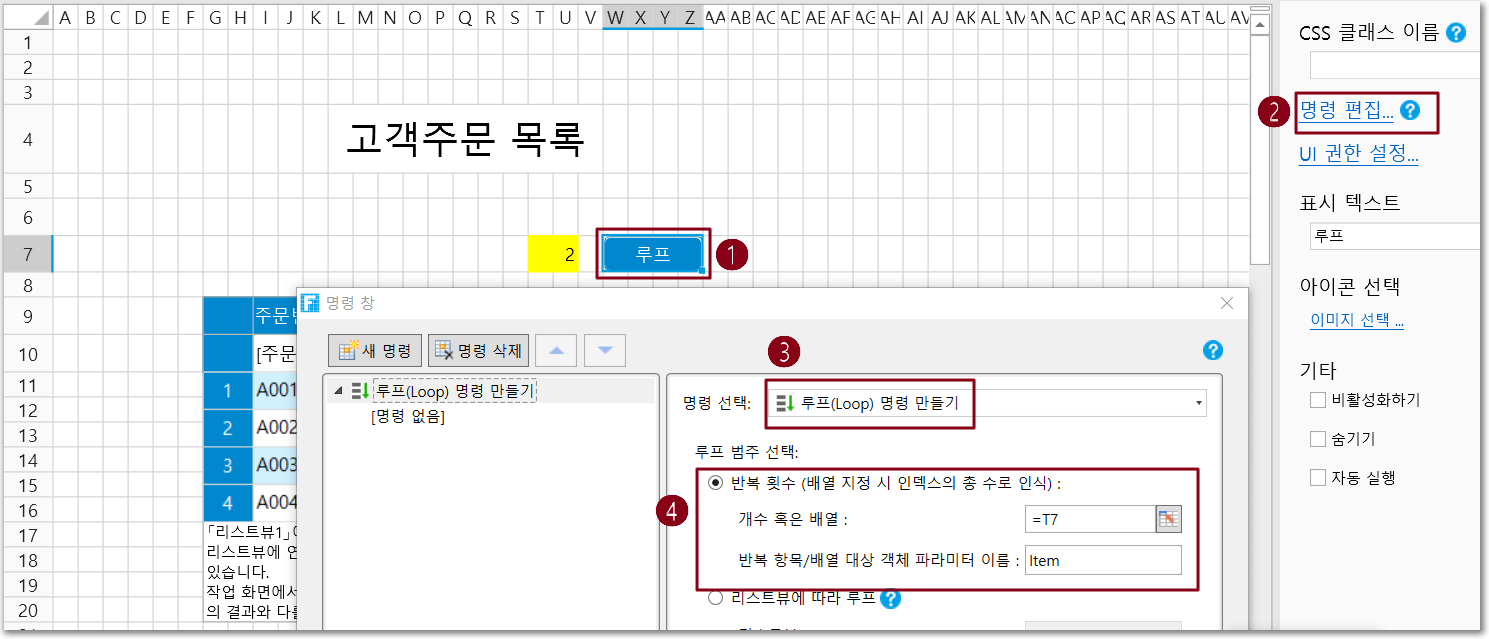 예를 들어 주문 목록 페이지의 루프 버튼에서 명령을 루프 명령으로 설정하고, 지정된 횟수만큼 반복하는 루프를 선택하고, 셀 T7의 값을 설정합니다.
