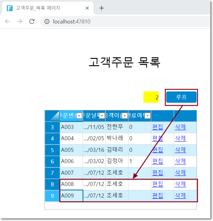 실행 후 주문 목록 페이지의 "루프" 버튼을 클릭하면 테이블 아래에 두 개의 새 레코드가 추가된 것을 볼 수 있습니다.