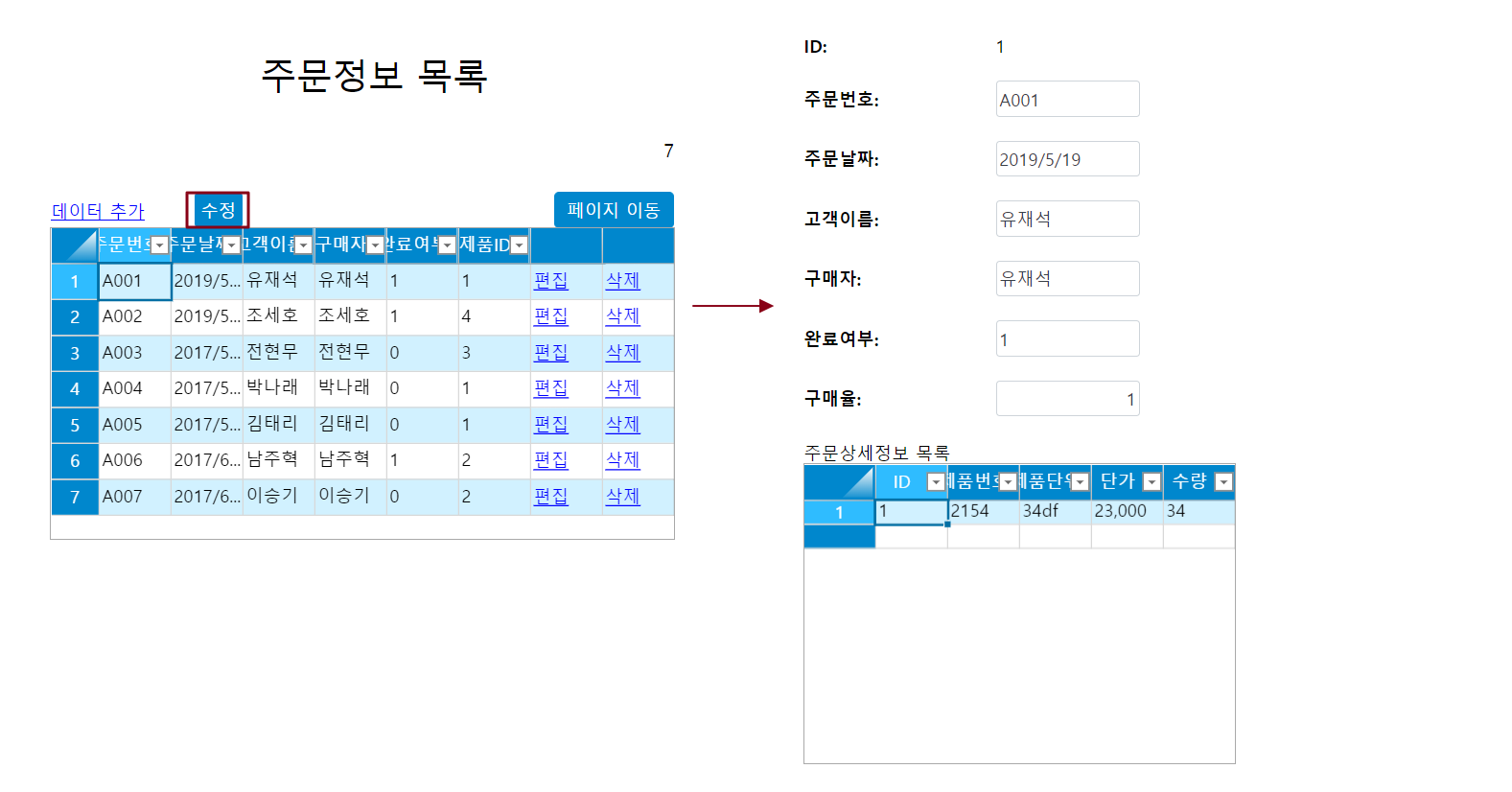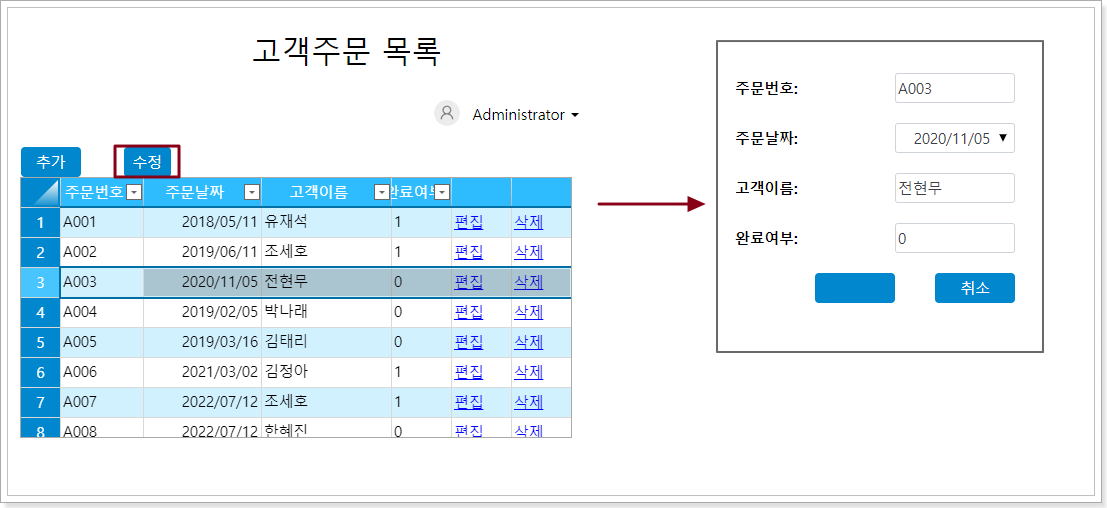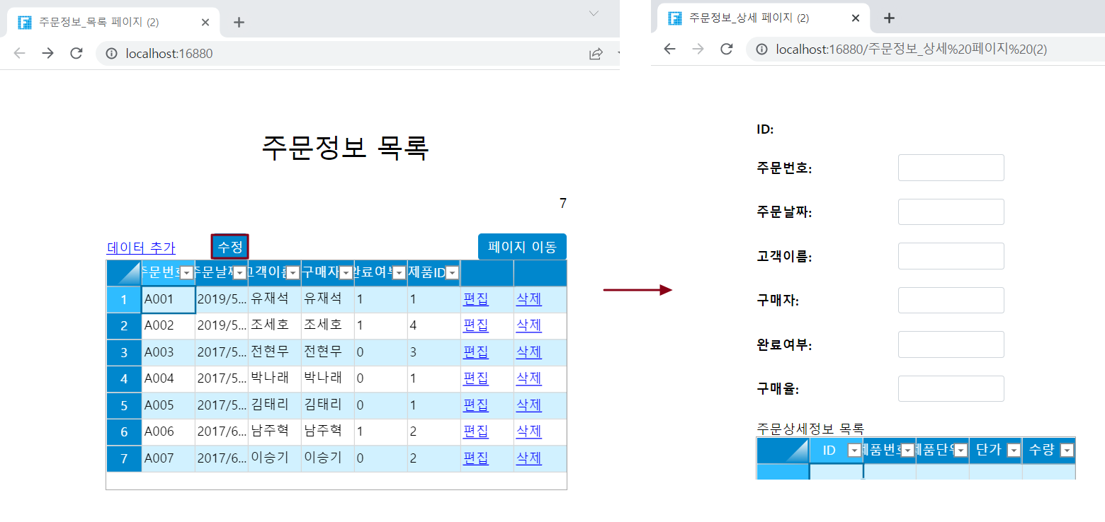 테이블의 두 번째 행을 선택하고 [수정] 버튼을 클릭하여 다음 그림과 같이 바인딩된 필드의 데이터를 로드하는 편집 페이지로 이동합니다.