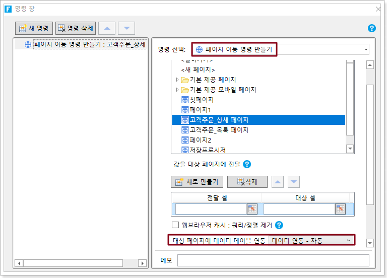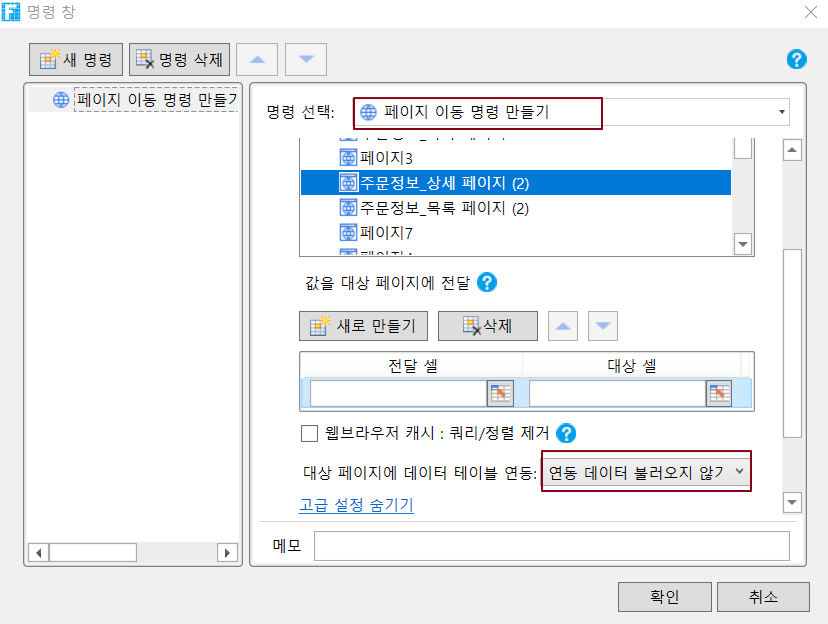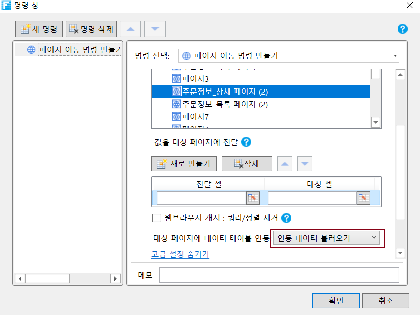 연동 데이터 불러오지 않기 : 바인딩된 데이터가 로드되지 않습니다. 일반적으로 대상 페이지에 데이터 테이블 작업 명령이 포함되어 있고 작업 유형이 추가된 경우 이 옵션을 사용하는 것이 좋습니다.