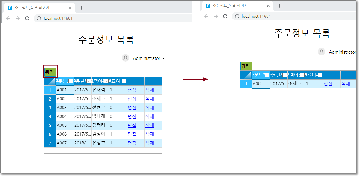 실행 후 쿼리 버튼 클릭하여 구매자가 조세호이고 완료된 주문을 주문 테이블에서 쿼리할 수 있습니다.