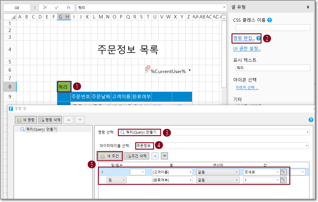 예를 들어 주문 목록 페이지에서 쿼리 버튼 설정하는 명령은 쿼리만들기이고 쿼리 테이블은 주문정보 테이블이며, 새 조건을 클릭하여 쿼리 조건을 추가하고, 쿼리 조건은 구객이름과 동일하며, 다음 그림과 같이 완료되었는지 여부가 완료되었는지 입니다.