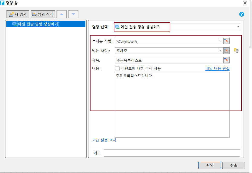 예를 들어 주문 목록 페이지에서 메시지 보내기 버튼 설정하고 다음 그림과 같이 보낸 사람, 받는 사람, 제목 및 메시지 내용을 설정하는 메일 보내기 명령입니다.