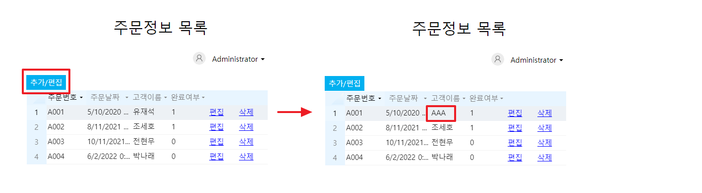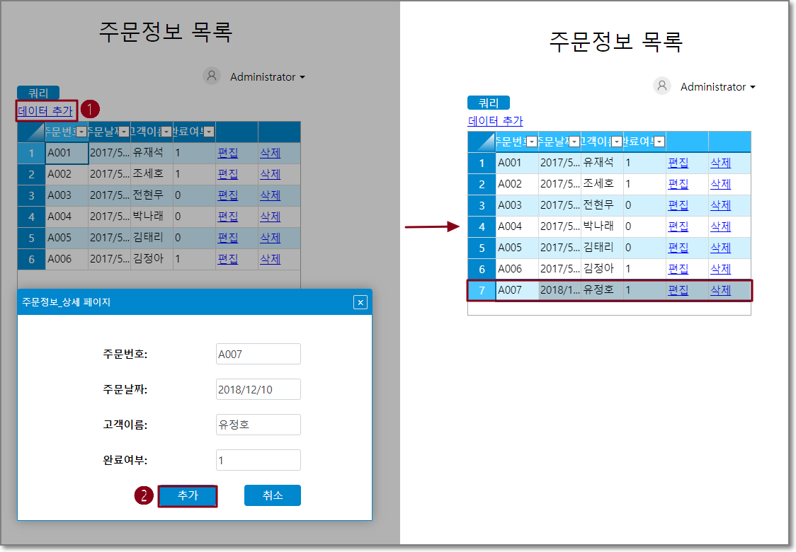페이지를 실행한 후 주문정보 목록페이지의 데이터 추가 버튼을 클릭하여 주문 데이터를 입력한 후 확인을 클릭하는 추가 페이지를 표시합니다. 이 시점에서 테이블에 방금 추가된 주문 데이터가 하나 더 있습니다.