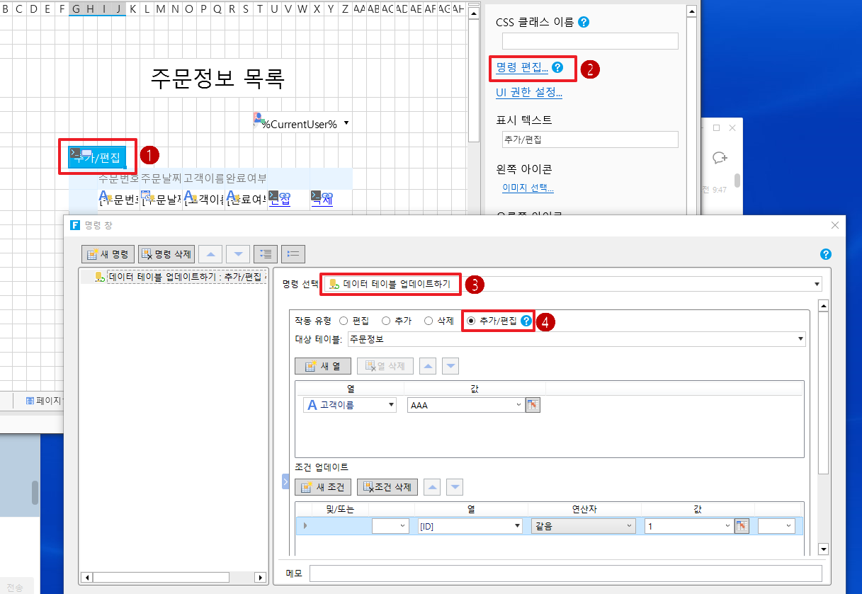 예를 들어 주문 목록 페이지의 "추가/편집" 버튼에 "데이터 테이블 작업" 명령이 설정되고 작업 유형이 "추가/편집"이고 대상 테이블이 "주문 테이블"입니다.