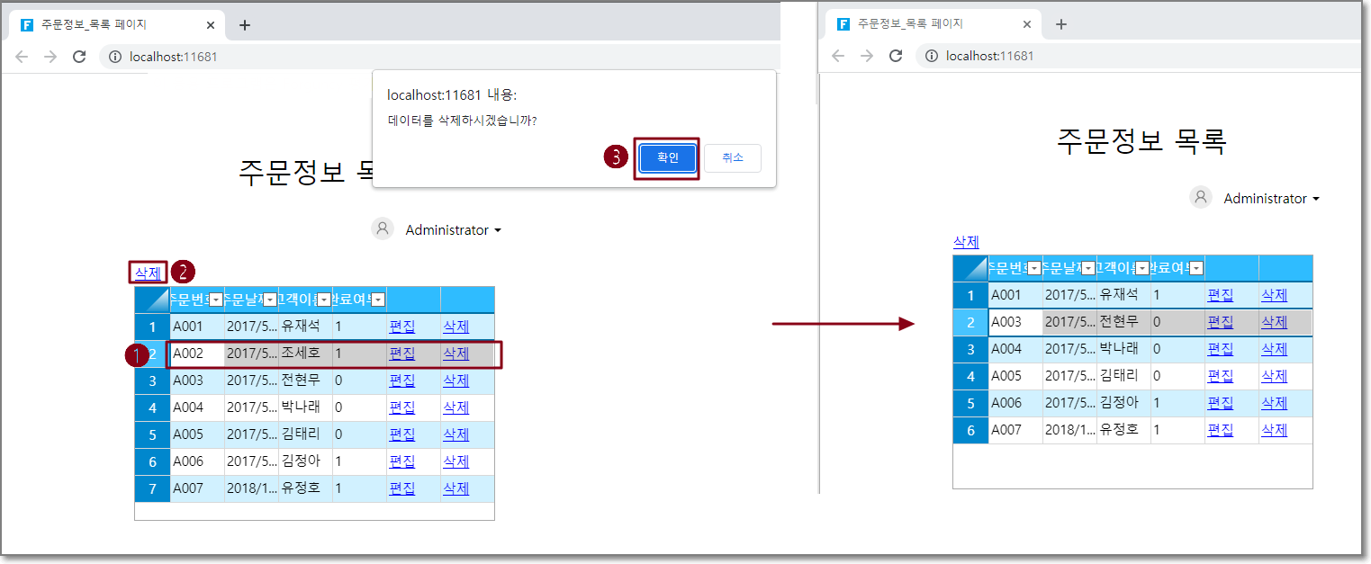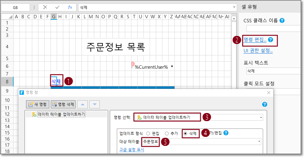 예를 들어 주문 목록 페이지의 삭제 버튼에서 삭제 및 대상 테이블의 작업 유형에 대한 데이터 테이블 작업을 설정합니다.