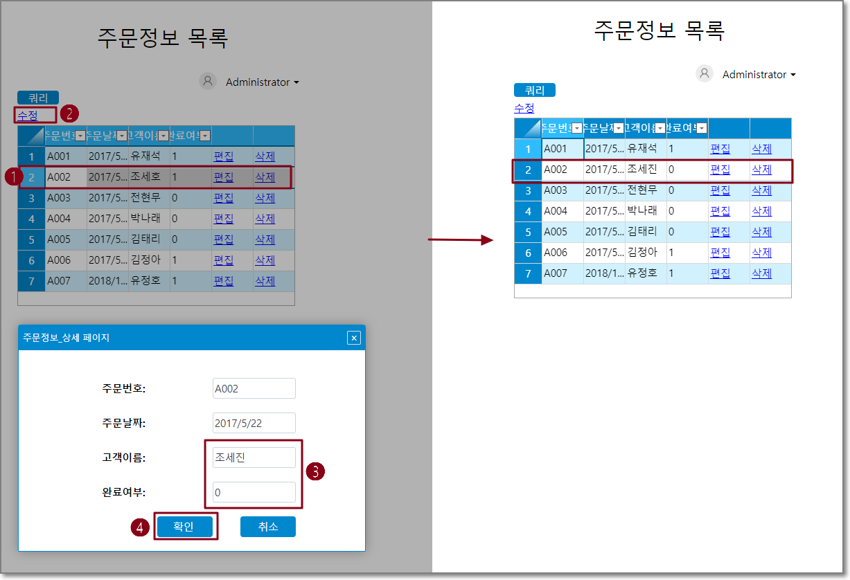 페이지를 실행한 후 주문 목록 페이지에서 데이터 행을 선택하고 수정 버튼을 클릭하고 수정 페이지를 팝업한 다음 데이터를 수정한 후 확인을 클릭합니다. 테이블의 주문 데이터가 수정된 데이터로 업데이트되었음을 알 수 있습니다.