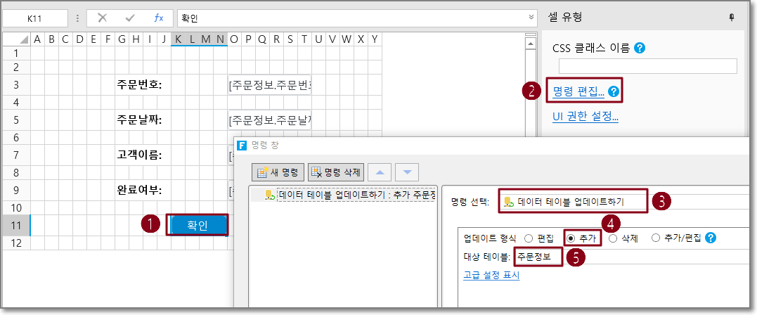 예를 들어 추가 페이지의 확인 단추에서 작업 유형이 추가되고 대상 테이블이 주문 테이블인 데이터 테이블 작업 명령을 설정합니다.
