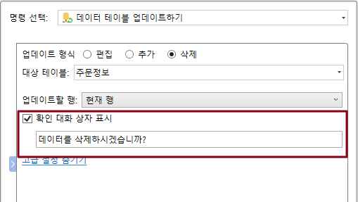 데이터 테이블 작업 명령에서 [고급 설정]을 클릭하고 첫 번째 항목을 [팝업 확인 대화 상자]로 설정하고 이 옵션을 선택하면 데이터 테이블 작업 명령을 실행할 때 확인 대화 상자가 나타납니다. 대화 상자의 표시 텍스트를 사용자 지정할 수 있습니다.