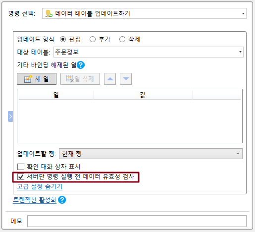 이 옵션을 선택하지 않으면 데이터 테이블 작업 명령을 실행할 때 데이터 유효성 검사가 수행되지 않고 데이터 테이블 작업 명령이 직접 실행됩니다.