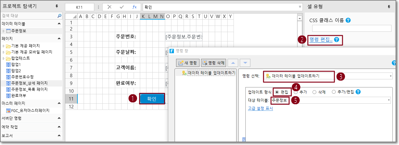 예를 들어 주문 수정 페이지에서 확인 버튼 작업 유형이 업데이트되고 대상 테이블이 주문 테이블인 데이터 테이블 작업 명령을 설정합니다.