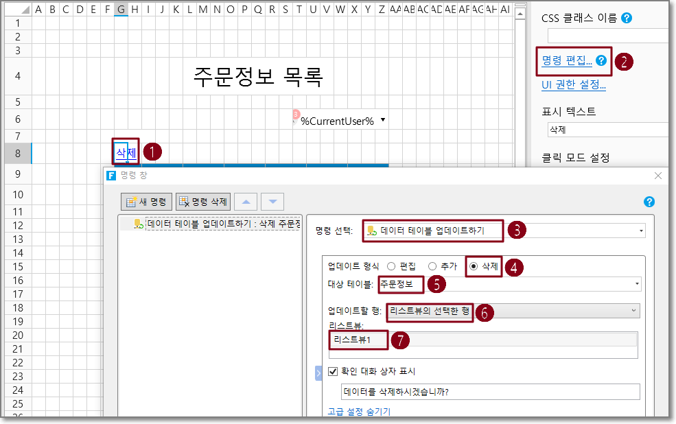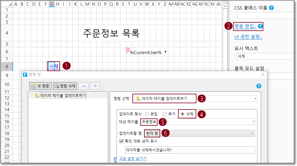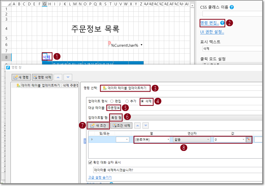 예를 들어 데이터 테이블 작업 명령에서 작업 유형은 삭제이고 대상 테이블은 주문 테이블이며 현재 행을 선택합니다.