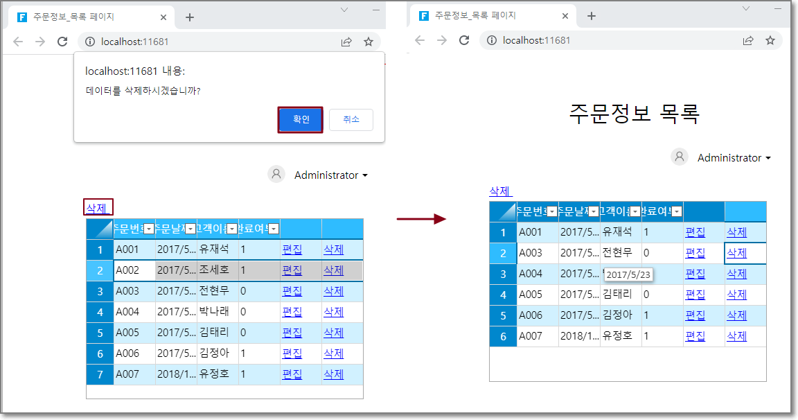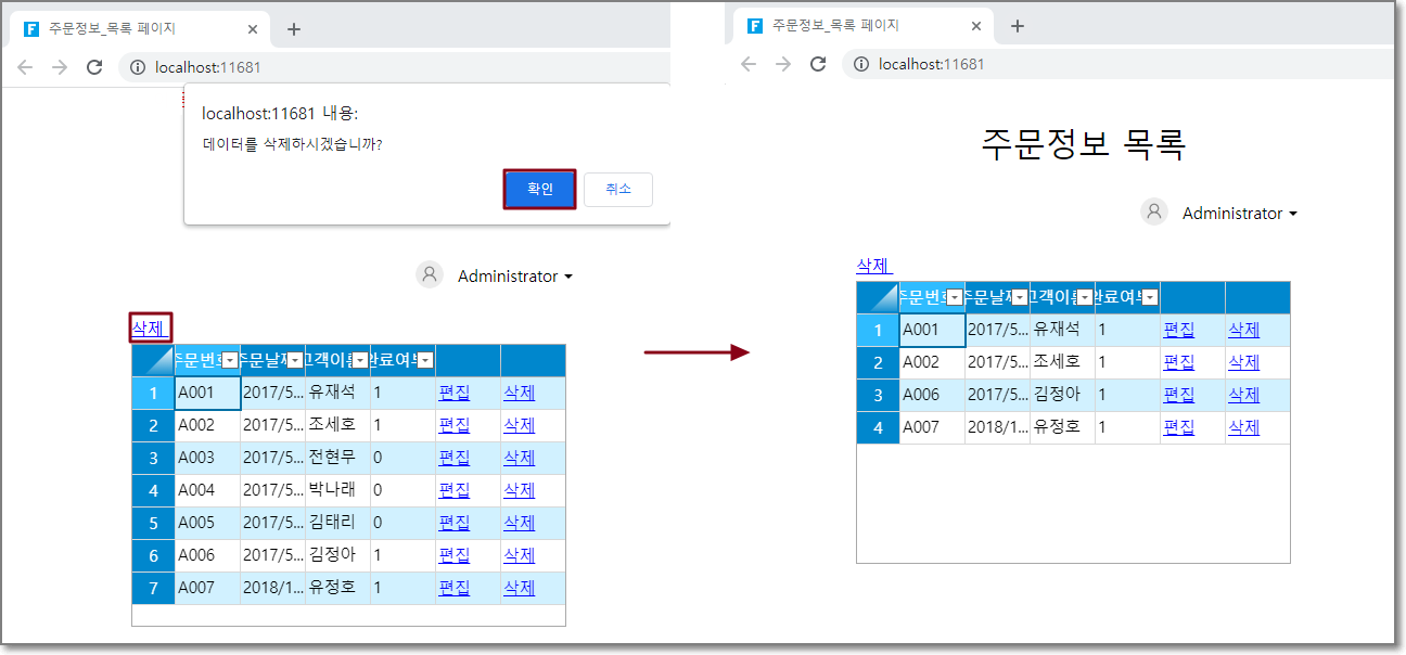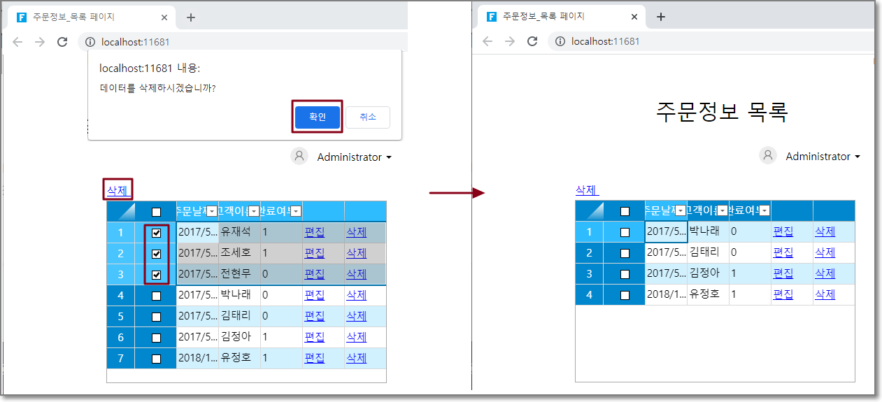 실행 후 삭제 버튼을 클릭하고 확인을 클릭합니다. 주문 목록의 완료여부가 0인 레코드가 모두 삭제되었음을 알 수 있습니다.