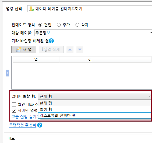 데이터 테이블 작업 명령에서 작업 유형이 편집 또는 삭제인 경우 고급 설정에서 현재 행, 특정 행 또는 선택 행을 비롯한 작업별 레코드를 설정할 수 있습니다.