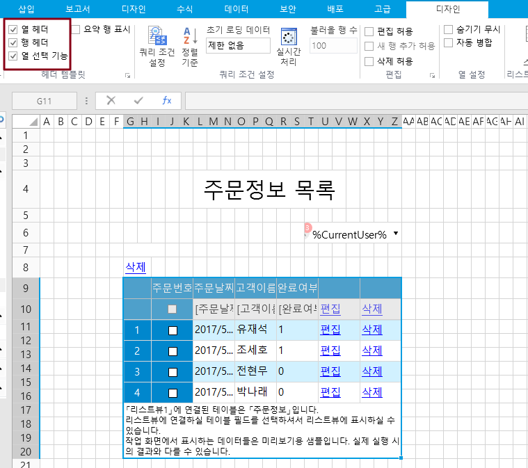 리스트뷰의 선택한 행: 테이블의 행을 선택합니다. 행 선택은 행 헤더 또는 선택 열로 테이블에서 선택한 행을 나타냅니다.