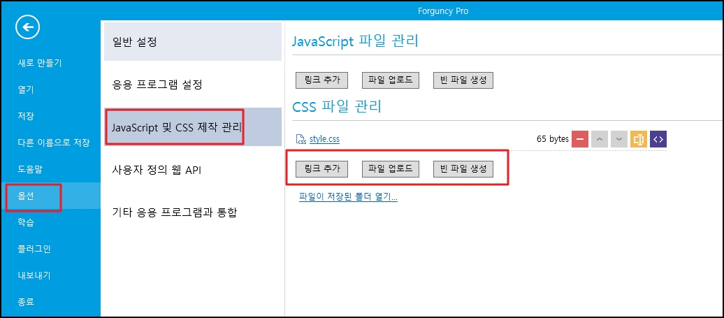 CSS 파일을 새로 만들거나 업로드합니다. [파일-> 설정-> 사용자 정의 JavaScript/CSS를 선택하고 [CSS 파일 업로드] 영역에서 [링크 추가], [파일 추가] 또는 [새 파일]을 선택합니다.