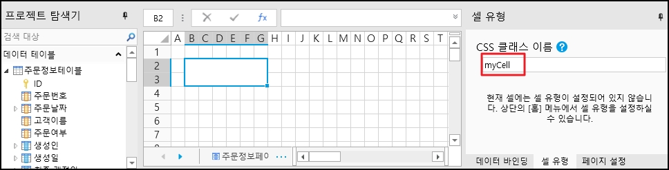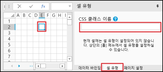 CSS 클래스 이름을 설정할 셀을 선택하고 [셀 유형] 탭을 클릭하고 [CSS 클래스 이름]에 설정할 이름을 입력합니다.
