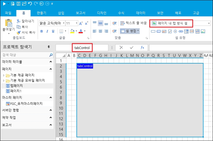 탭 페이지에서 셀 범위를 선택하고 탭으로 설정하고 이름을 "tabControl"로 지정합니다.