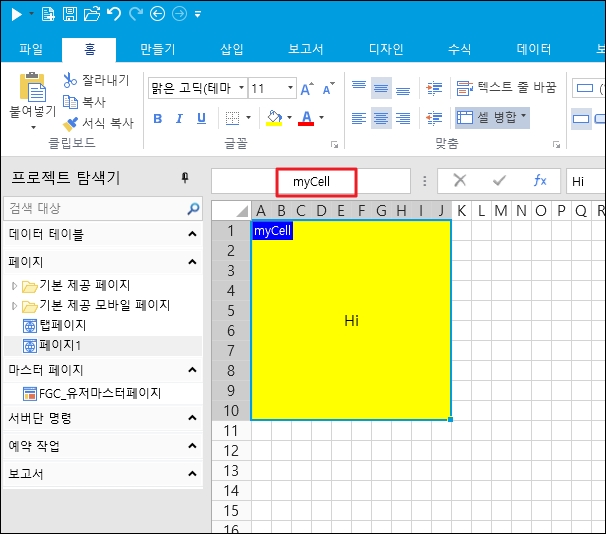 페이지 1을 열고 페이지 행과 열 수를 모두 10으로 설정하고 페이지에서 셀 범위를 선택하여 myCell이라는 이름을 지정합니다. 값을 입력합니다.