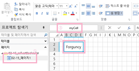 페이지 한 개 생성합니다. “텍스트 상자” 유형의 셀을 생성하고, 왼쪽위 Cell Name으로 myCell이라고 이름을 지정합니다.