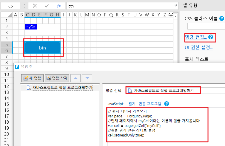 2. &#x20;셀 범위를 선택하고 셀 유형을 버튼으 설정하고 명령을 \[JavaScript 명령]으로 편집하고 JavaScript 코드를 입력합니다.