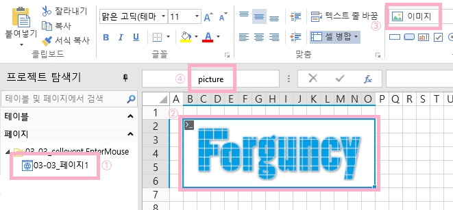 페이지 한 개 생성하고, 이미지 셀을 생성하여 그림을 삽입합니다. 이후 왼쪽 상단의 Cell Name에 picture라고 입력합니다.