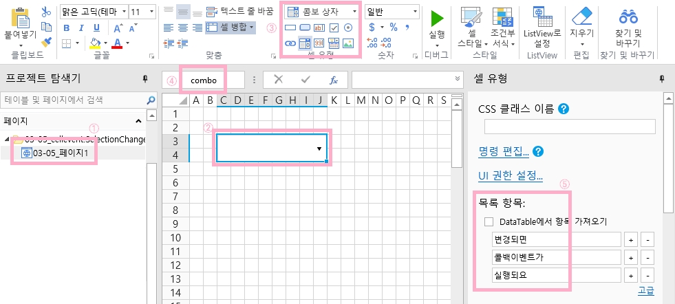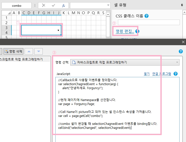 2. 콤보박스 셀을 클릭 후 ‘명령 편집’에서 “자바크스립트로 직접 프로그래밍하기” 명령을 추가하여, 코드를 입력합니다.
